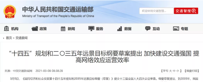 3月5日,《國(guó)民經(jīng)濟(jì)和社會(huì)發(fā)展第十四個(gè)五年規(guī)劃和2035年遠(yuǎn)景目標(biāo)綱要(草案)》提交十三屆全國(guó)人大四次會(huì)議審查。綱要草案提出,到2035年,我國(guó)將基本實(shí)現(xiàn)社會(huì)主義現(xiàn)代化,基本實(shí)現(xiàn)新型工業(yè)化、信息化、城鎮(zhèn)化、農(nóng)業(yè)現(xiàn)代化,建成現(xiàn)代化經(jīng)濟(jì)體系。綱要草案中,交通運(yùn)輸是“高頻詞匯”,在建設(shè)現(xiàn)代化基礎(chǔ)設(shè)施體系、打造數(shù)字經(jīng)濟(jì)、促進(jìn)區(qū)域協(xié)調(diào)發(fā)展等多個(gè)方面均作出明確要求,第十一章第二節(jié)專門提出加快建設(shè)交通強(qiáng)國(guó)。