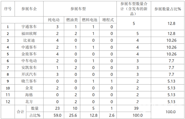 從客車整車企業(yè)參展數(shù)量我們不難看出,這次共有12個企業(yè)帶來39款客車車型參展,其中宇通、福田歐輝參展車型數(shù)量最多,均為5款,占比均為12.8%,陣容最強大;其次是比亞迪、金旅和中通客車,這三家均帶來4款車型參展,占比均為10.26%;然后是安凱客車、開沃汽車均帶來3款車型參展,占比均為7.7%;第四是金龍、海格和北方客車、曉蘭客車均帶來2款(不含1款燃料電池清洗車)車型參展,占比均為5.13%。