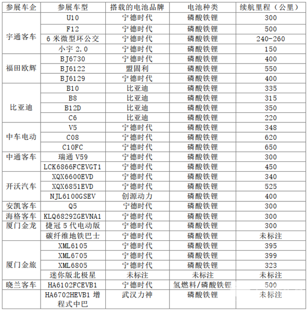 上表顯示,此次展會,宇通客車、福田歐輝、比亞迪、中通客車、中車電動、安凱客車、開沃汽車等客車企業(yè),共攜40款整車產(chǎn)品參展,包括29款新能源客車和10款燃油客車以及1款氫燃料電池清洗車。在29款新能源客車中,搭載的電池以磷酸鐵鋰電池為主要技術(shù)路線,電池品牌以寧德時代占比最高,其次是比亞迪,具體如下表:
