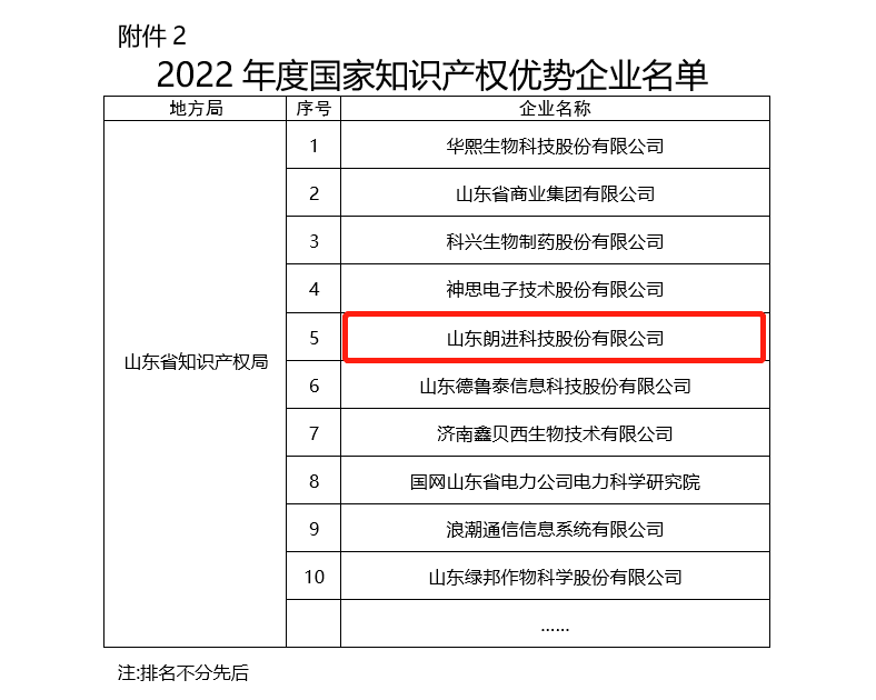近日,國(guó)家知識(shí)產(chǎn)權(quán)局對(duì)2022年度國(guó)家知識(shí)產(chǎn)權(quán)優(yōu)勢(shì)企業(yè)和示范企業(yè)評(píng)定結(jié)果進(jìn)行了公示。經(jīng)企業(yè)自主申報(bào)、地方擇優(yōu)推薦、國(guó)家知識(shí)產(chǎn)權(quán)局組織專家評(píng)審及核查確認(rèn)等程序,全國(guó)共有2513家企業(yè)被認(rèn)定為國(guó)家知識(shí)產(chǎn)權(quán)優(yōu)勢(shì)企業(yè),其中山東省共計(jì)100家企業(yè)。山東朗進(jìn)科技股份有限公司順利通過(guò)審核,成功入選!