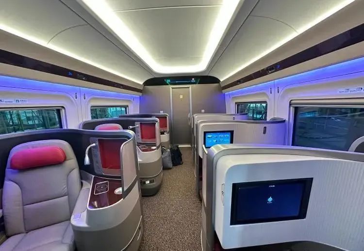 服務設施舒適便捷。車廂座椅均基于人因工程學進行優(yōu)化,讓旅客乘坐更加舒適、體驗更美好。二等座椅靠背上增加方便旅客使用的USB充電接口,加深小桌板杯托凹槽深度,提高水杯放置的穩(wěn)定性。一等座椅增加電動腿靠、可調(diào)節(jié)頭靠,座椅間設置雙USB口插座,方便旅客取用。商務倉采用“魚骨式”布局設計,一人一艙,保證乘坐私密性,座椅增加無線充電、手機投屏、在線觀影等功能,滿足商務旅客需求。4號車廂為無障礙車廂,配備更寬的通過門、無障礙衛(wèi)生間、輪椅及大件行李放置區(qū)等,所有服務設施均增加盲文標識,更好地滿足特殊旅客的出行需求。